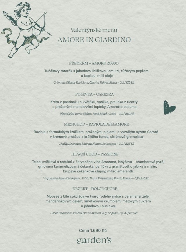 Na sobotu 14.2. pro vás připravujeme zamilovanou atmosféru, cely interiér bude laděný tak, aby se z obyčejného dne stal zážitek, který patří jen vám dvěma. A protože letos vychází Valentýn na sobotu, je to ideální příležitost užít si Garden‘s nejen večer, ale také při klidném a krásném valentýnském obědě.