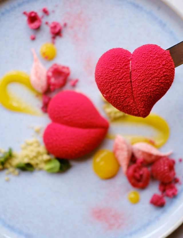 DOLCE CUORE | Romantickou, ale naprosto “ vybombenou” tečkou bude mousse z bílé čokolády ve tvaru rudého srdce s calamansi želé, mandarinkou, limetkovým crumblem a mátovým cukrem.