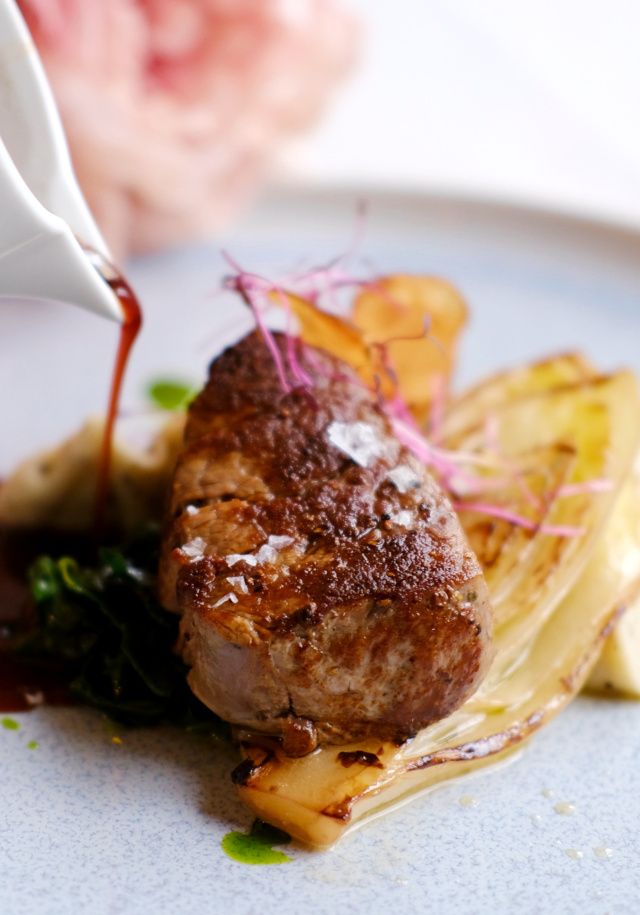 PASSIONE - Hlavním chodem je telecí svíčková s redukcí ze slavného červeného vína Amarone, hedvábné lanýžovo-bramborové pyré, karamelizovaná čekanka, perličky z granátového jablka a malin. Čekejte intenzivni, hlubokou chuť delikátní omáčky, která je skutečným srdcem celého chodu.