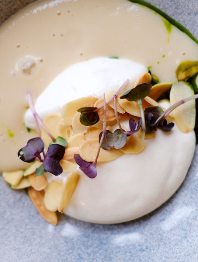 CAREZZA - Jemný krém z pastináku a květáku s dotekem vanilky. Ricottová pralinka, pražené mandle a nadýchaná Amaretto espuma. Unikátní valentýnská romantická chuť od našeho šéfkuchaře.