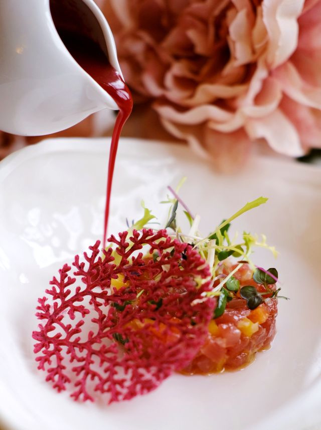AMORE ROSSO - Tuňákový tatarák v elegantní, svěží podobě doplňuje jahodovo-ibišková emulze, růžový pepř a jemná kapka chilli oleje. Lehce pikantní, ovocný a hravý začátek, který probudí všechny smysly.